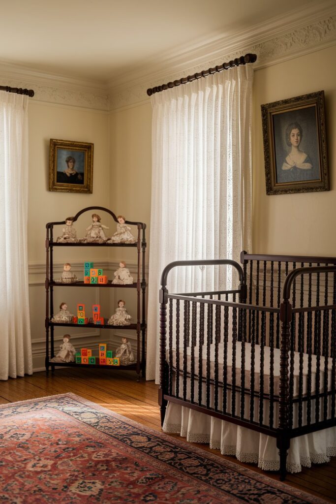 Inspired by French vintage styles, this room offers elegance with antique white furniture and gold accents. Pale grey walls complement lace-trimmed bedding and a tulle canopy over the bed. A chandelier casts a soft glow, while vintage glass cabinets display paper dolls and ribbons. The room exudes a sense of delicate luxury, perfect for a timeless nursery.
